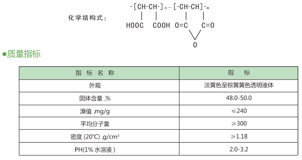 ZA-Z325D產(chǎn)品是由馬來(lái)酸酐均聚而成的一種低分子量聚羧酸型高效阻垢劑。由于分子中具有多個(gè)羧酸基官能團(tuán),故對(duì)成垢物質(zhì)能起干擾和破壞作用,使晶體發(fā)生畸變,從而使沉淀物或污泥流態(tài)化,易于排出系統(tǒng)。此外,HPMA具有化學(xué)穩(wěn)定性和熱穩(wěn)定性高,不易水解,低毒無(wú)害,適用堿性水質(zhì)以及可與有機(jī)膦酸鹽、鋅鹽、原油破乳劑混合使用等特點(diǎn)。